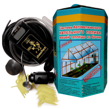 Капельный полив АкваДуся Старт 50 с ЖК дисплеем имеет оригинальный принцип работы: в накопительную емкость (бочку) набирается вода из вашего садового крана (по шлангу). По заполнению бочки дозирующий клапан прекращает подачу воды. Весь световой день вода в бочке греется на солнце. В любое назначенное Вами время, срабатывает электронное пусковое устройство, включающее пусковой насос. Нагретая вода через систему шлангов и тройников - разветвителей подается к капельницам, установленным под каждым растением, прямо в их прикорневую зону. Причем насос, запустив систему, автоматически выключается, а полив из бочки продолжается под своим давлением, - самотеком. Через 60 минут (или 80/120 минут) включается реверсный насос и полив останавливается. Далее наступает следующий цикл работы системы: наполнение бочки - дневной нагрев воды - автоматический полив, и т.д., пока есть вода в кране и хватает энергии батареек питания в пускателе (расчетный срок службы комплекта батареек -весь летний сезон). Вашу бочку вы можете наполнять любым способом (от крана, от насоса, ведрами, или дождевой водой).